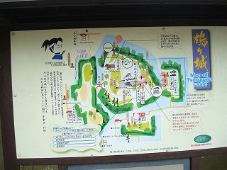 本丸の芝生と会津若松城(鶴ヶ城)の案内図