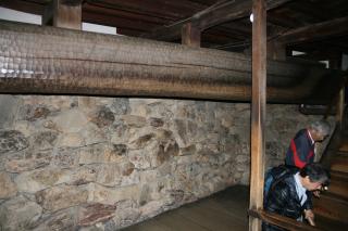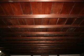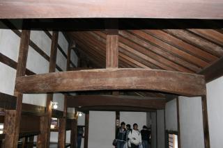 内部の梁と最上階の天井。天井は一般の民家のよう