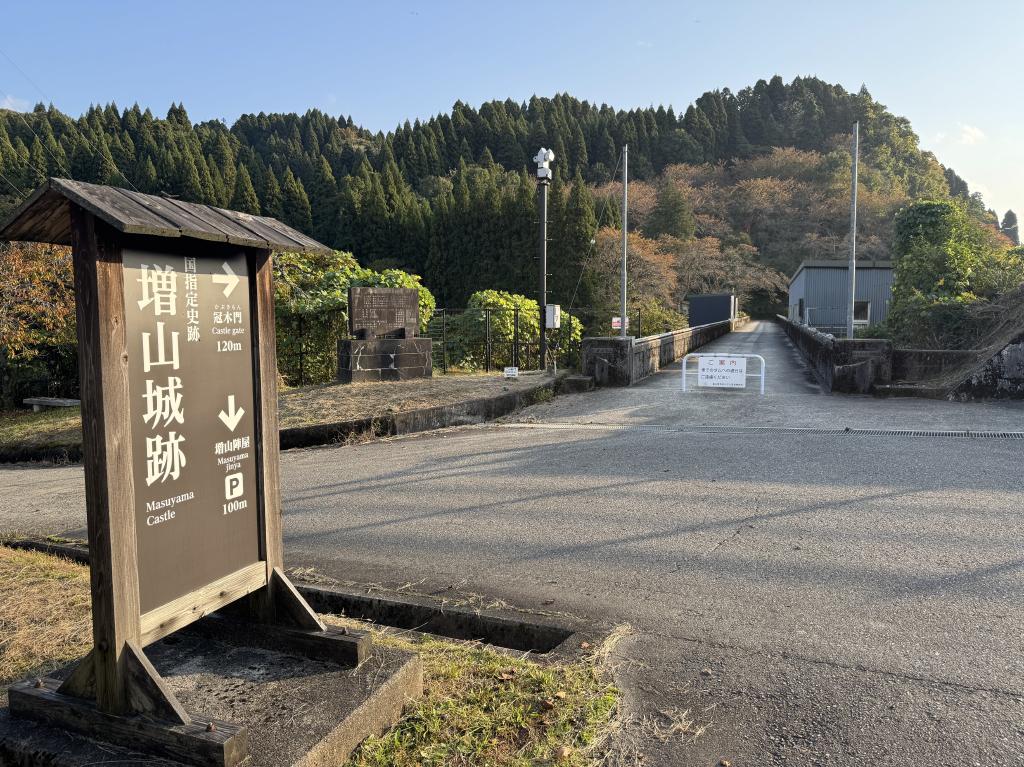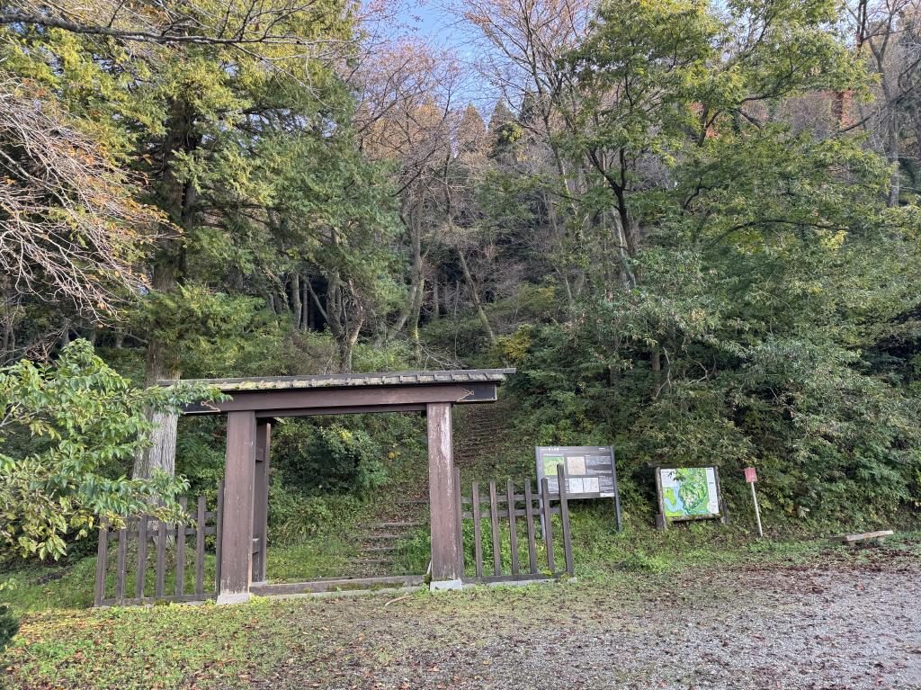 ダムを越えると冠木門が見えます