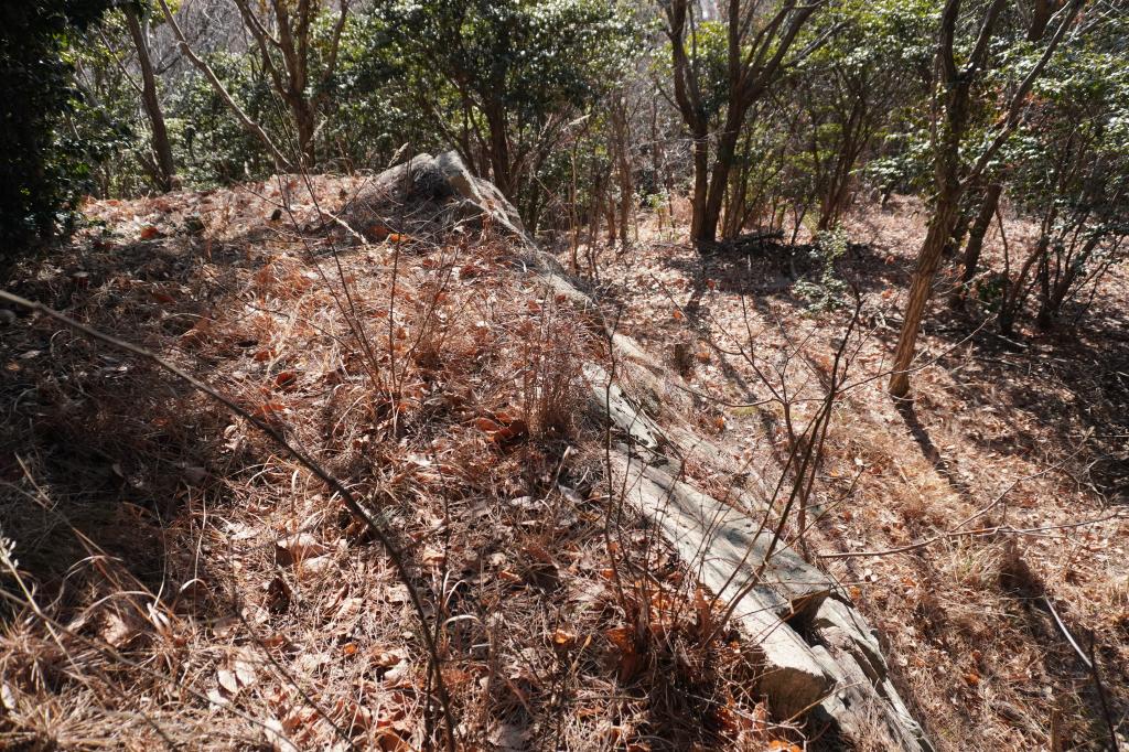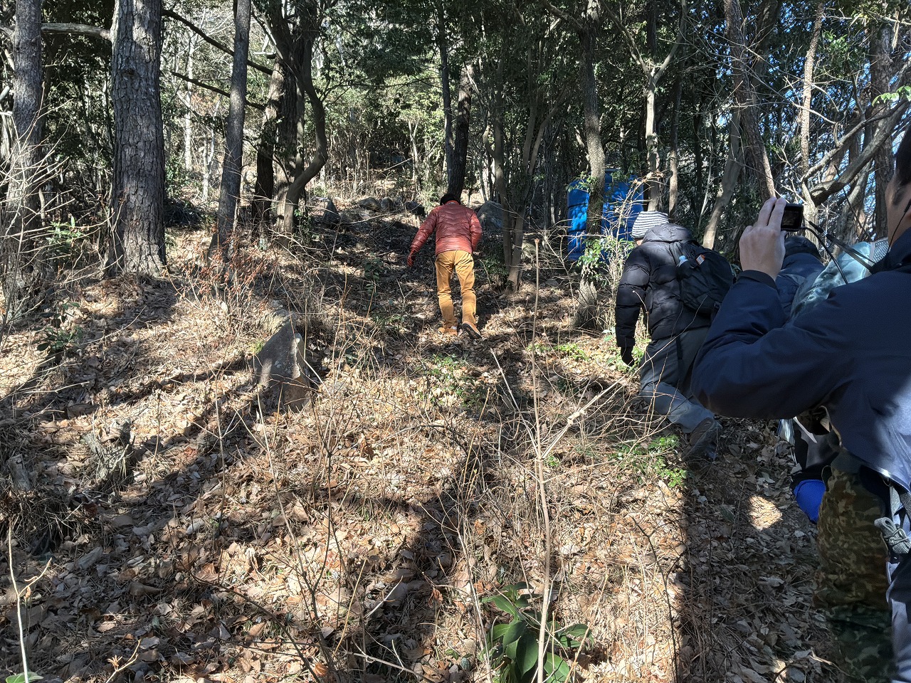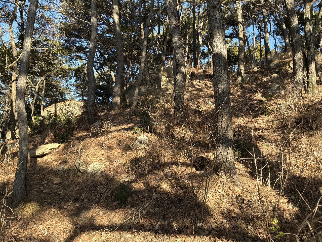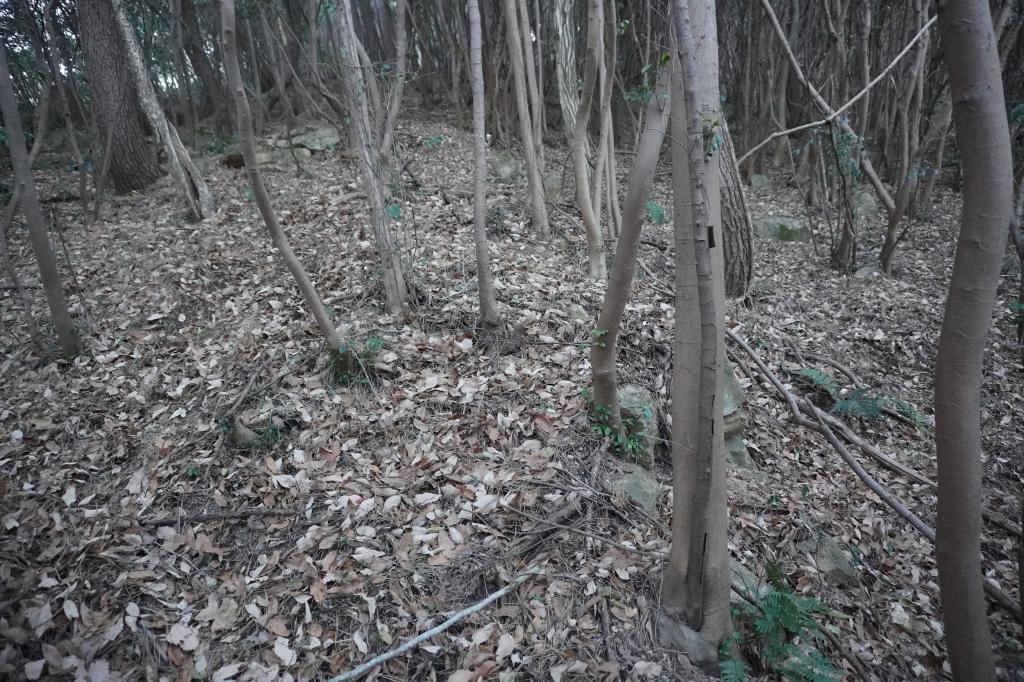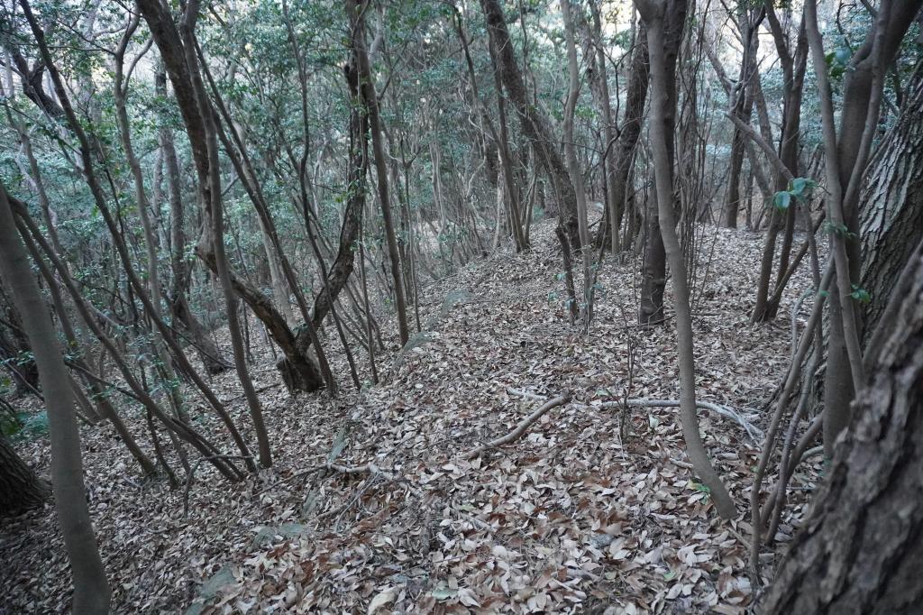 乾いた落ち葉の上を登っていくので滑る、滑る